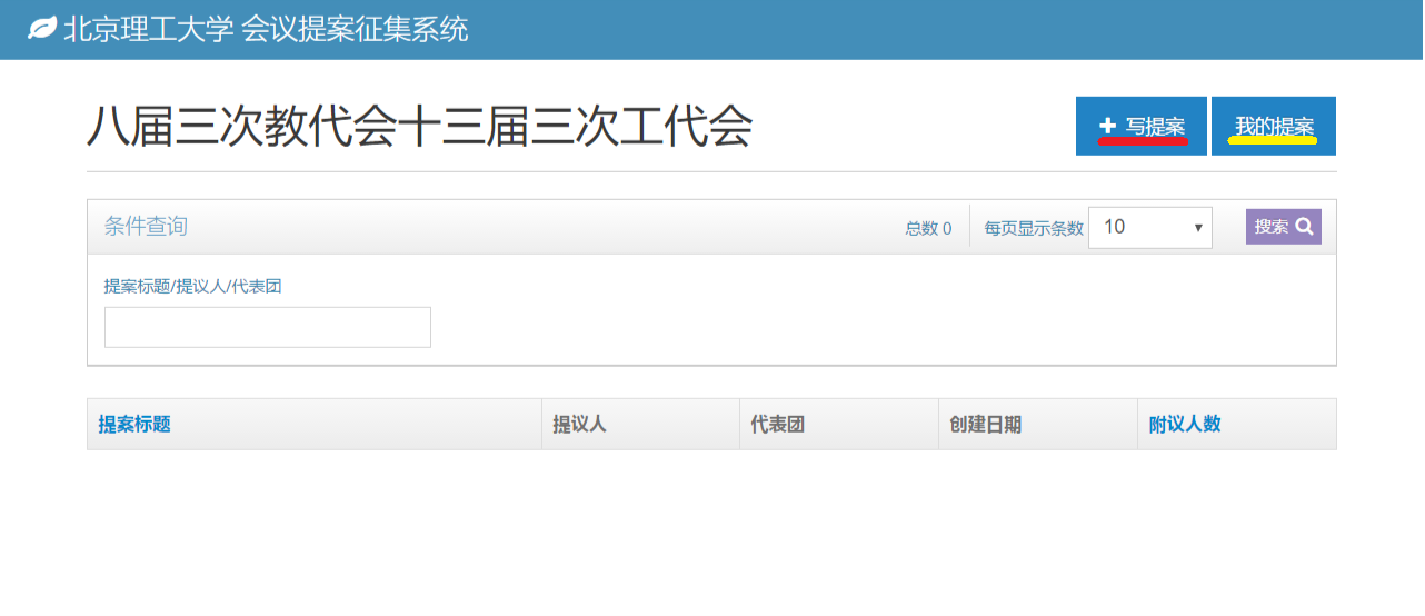 系统主界面分为三个区域:功能区(右上方)、筛选区(中间)、提案列表(下方)。其中提案列表显示了所有本次会议的已经发布的提案,所有代表可以点击提案标题查看填详细信息,以及对提案进行附议。