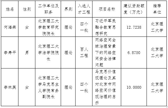 根据北京市委宣传部《2017年度北京市宣传文化高层次人才培养资助项目申报指南》,学校按要求组织了2017年度全市宣传文化高层次人才培养资助项目申报工作。日前,市委宣传部正式反馈我校申报项目评审结果,何海燕等3名教师的申报项目入选。现按照市委宣传部《关于开展2017年北京市宣传文化高层次人才培养资助拟入选项目公示等管理工作的通知》要求,对以下3个项目进行校内公示。